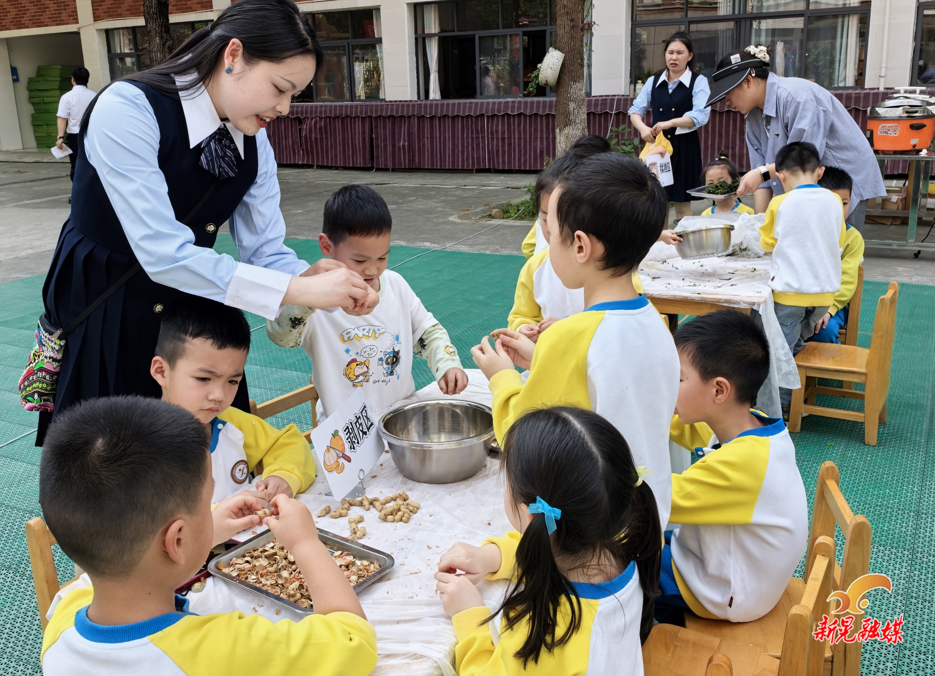 在食养实践展示环节,师生联袂演绎侗族民俗情景剧《过社》,生动再现了传统习俗的魅力。县幼儿园四季童耕教育基地管理员现场展示社饭食材,细致讲解艾草、野蒿等本土草药的药用功效与养生价值。随后,孩子们化身“小厨神”,亲手参与剥、揉、切、炒、拌等制作环节,在烟火气中沉浸式体验劳动的乐趣,品味舌尖上的“本草文化”,生动体现了中医药文化“从认知到实践、从课堂到生活”的落地路径。