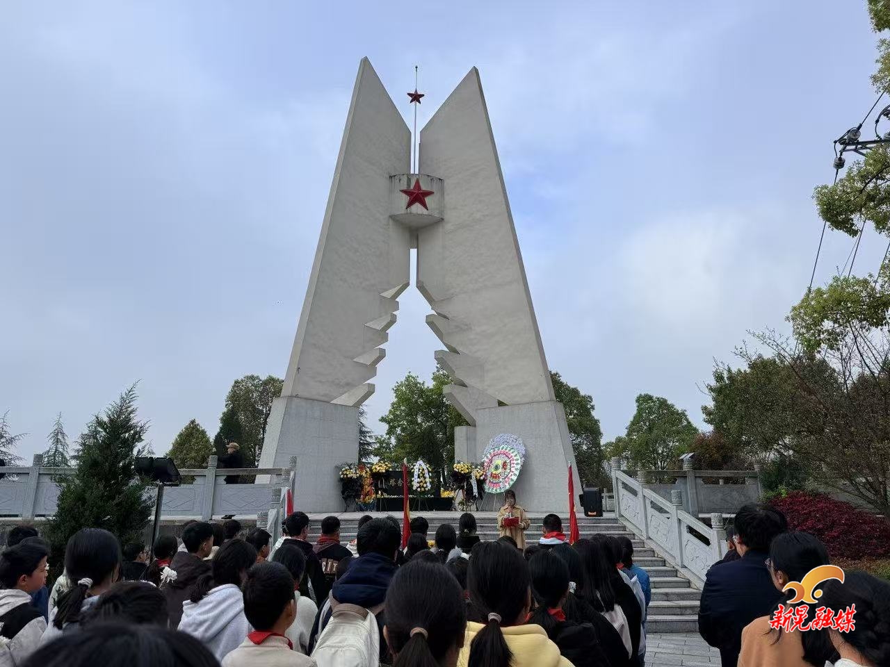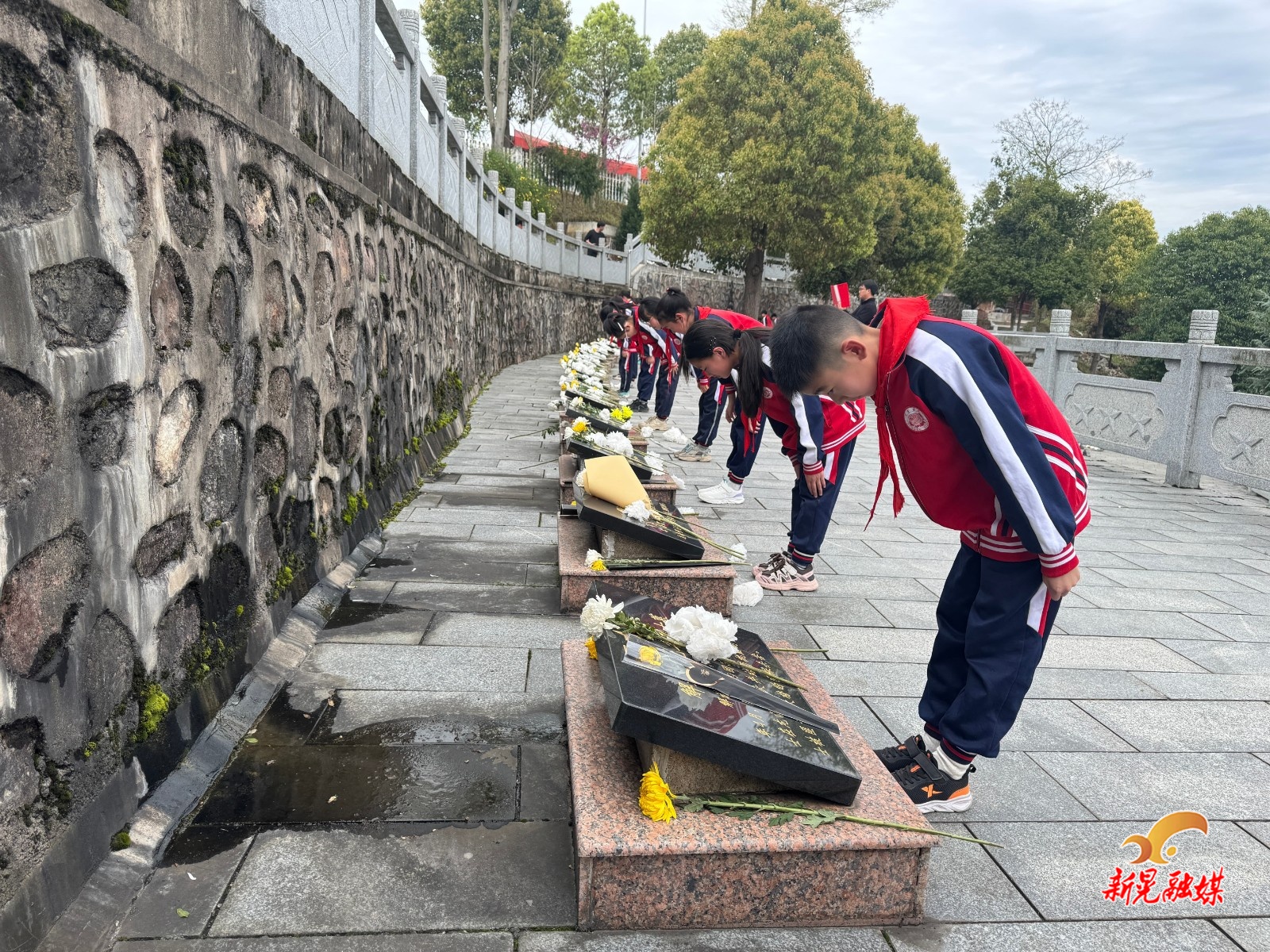 在烈士纪念塔前,全体师生整齐列队、庄严肃穆、奏唱国歌,并集体默哀三分钟。随后,学生代表敬献花篮,全体师生依次鞠躬行礼、敬献鲜花、擦拭墓碑,庄重缅怀革命先烈。