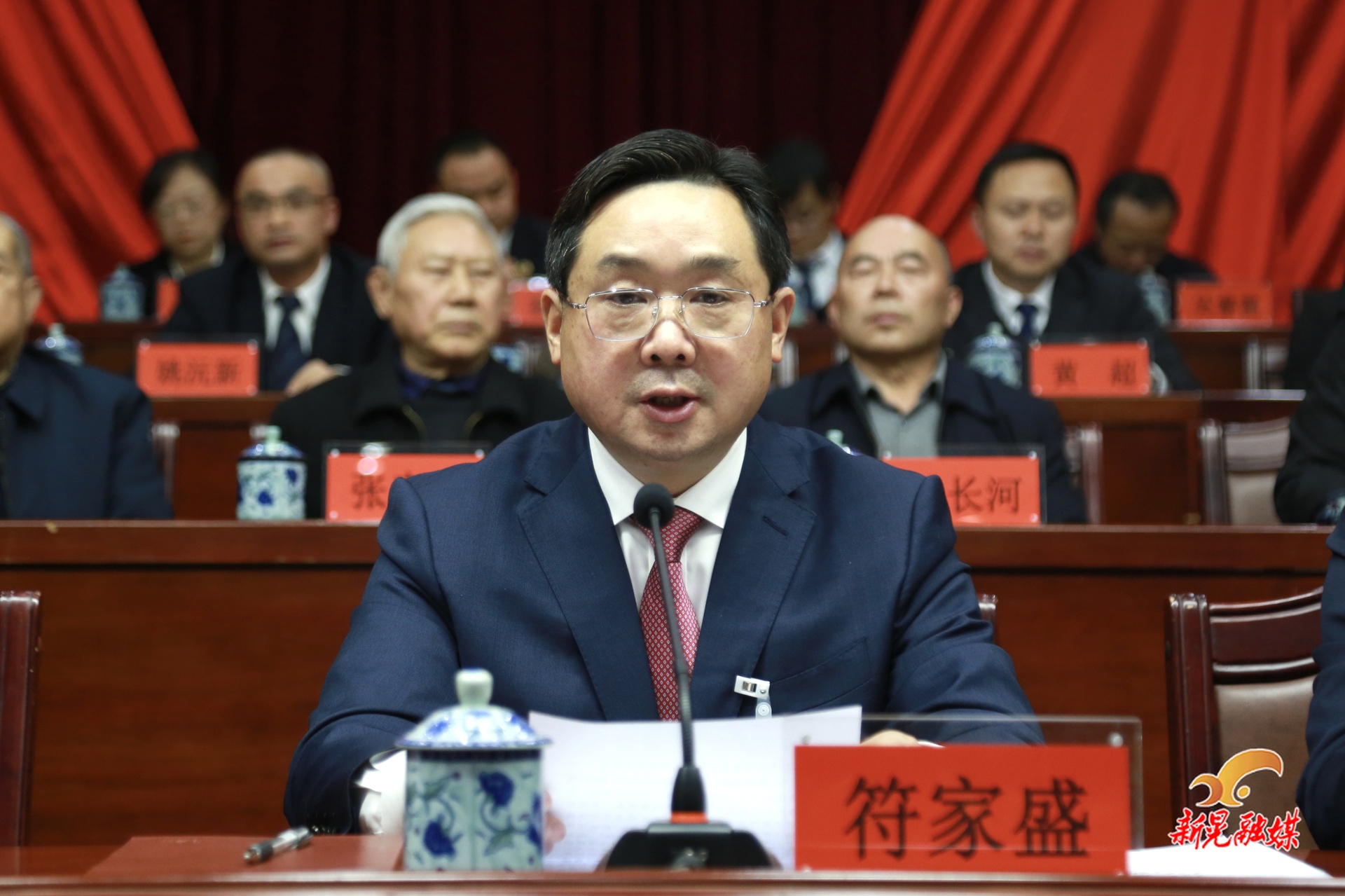 出席会议并在主席台前排就座的领导有:县委书记符家盛,县委副书记、县长杨鹏,县人大常委会党组书记、主任潘世新,县政协党组书记、主席田新益,县政协副主席蒲学东、杨瑛、田竑、姚茂林、杨伶婷,县政协党组成员、秘书长吴长明。